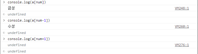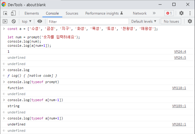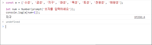 만약 prompt로 값:1을 입력받아왔다면 a[num]은 숫자 1로 암묵적 형변환이 되어 a[1]의 값인 '금성'이 출력되고,