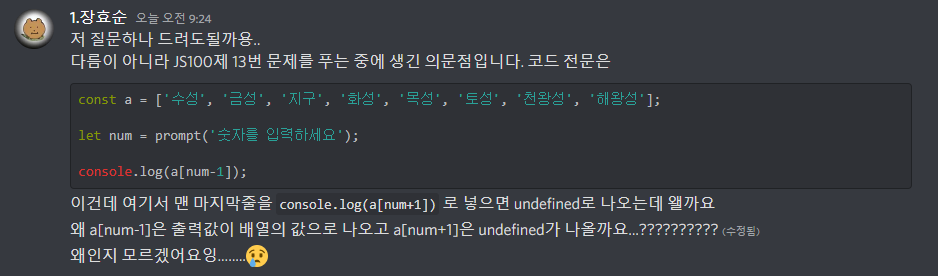 이런 코드를 작성하게 된 이유는 콘솔로 값을 찍다가 console.log(a[num+1]) 을 우연히 실행시켜봤는데 값이 undefined가 나오는 게 아닌가. 그래서 당연히 console.log(a[num-1]) 도 undefined가 나오지 않을까 해서 저렇게 num 계산을 별도로 해주는 답안을 작성하게 됐었다. 사실 책에서 제공하는 답안을 보고 의문이 들었는데, 왜 num+1했을 때는 출력이 안되고 num-1을 했을때는 값 출력이 정상적으로 되는지를 도저히 이해할 수가 없었다. 그래서 구글링도 해봤는데 도저히 어떤 키워드로 검색해야 할지 감이 잡히지 않아 같이 공부하는 동료들에게 질문을 던졌다.